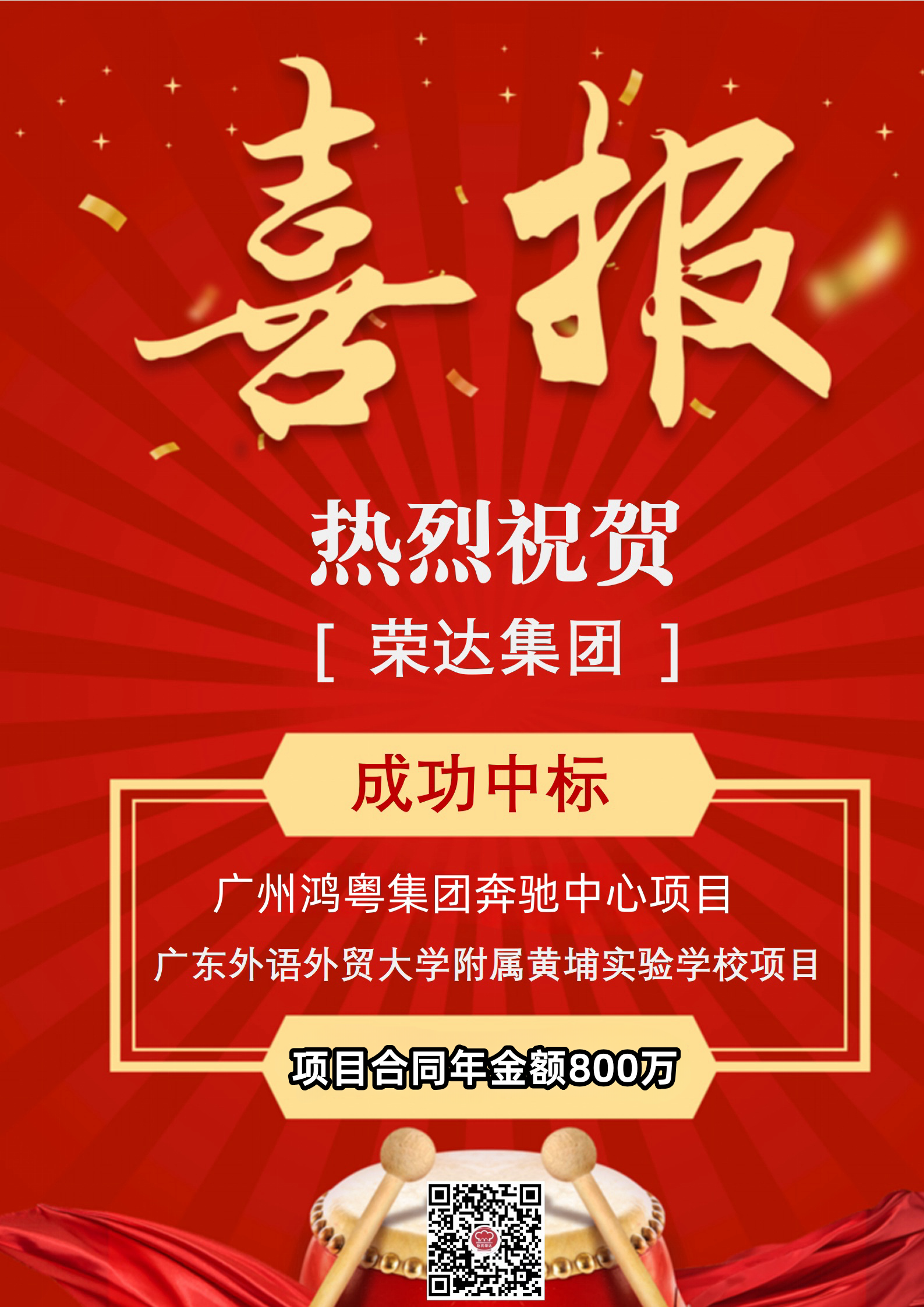 喜讯!近日,荣达集团成功中标广州鸿粤集团奔驰中心项目和广东外语外贸大学附属黄埔实验学校项目,项目合同年金额一共800万。